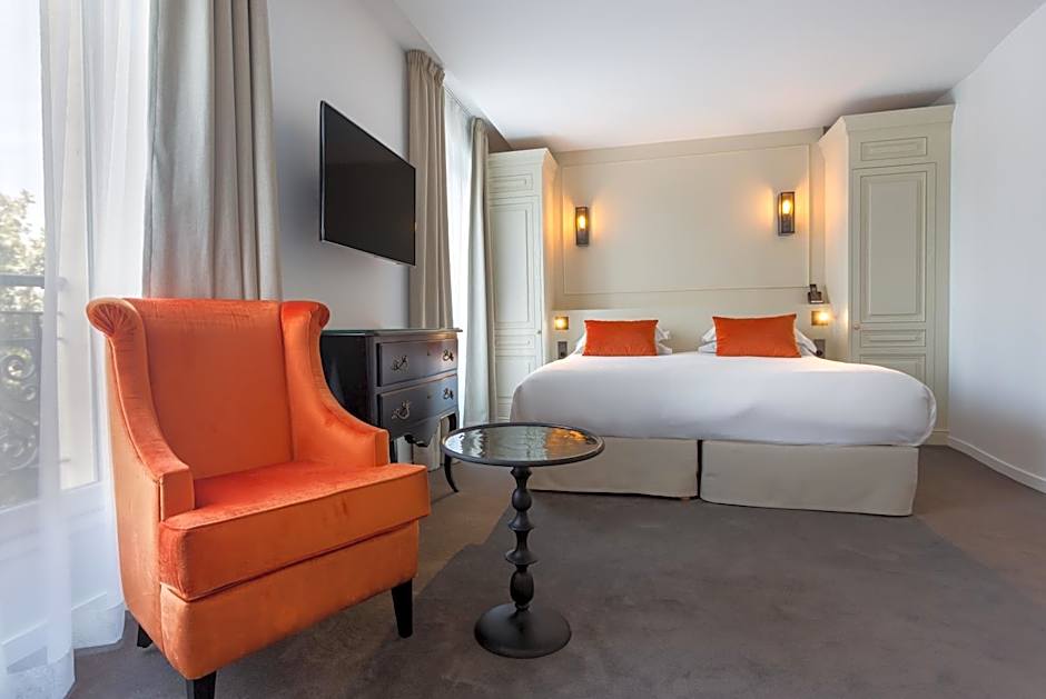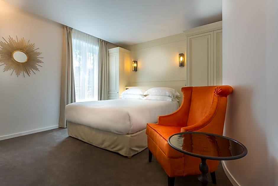 With an Eiffel Tower side view, this room has a flat-screen TV, a seating area as well as soundproofing and mini-bar. The private bathroom comes with a bath or a shower. This room is composed of 1 Double Room Baronne + 1 Double Room Marquise.