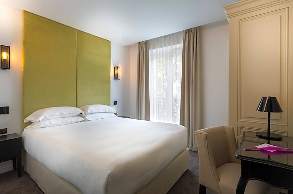 This double room has a satellite TV, tile/marble floor and air conditioning. It provides a side view on the Eiffel Tower (need to look on the side by the window)